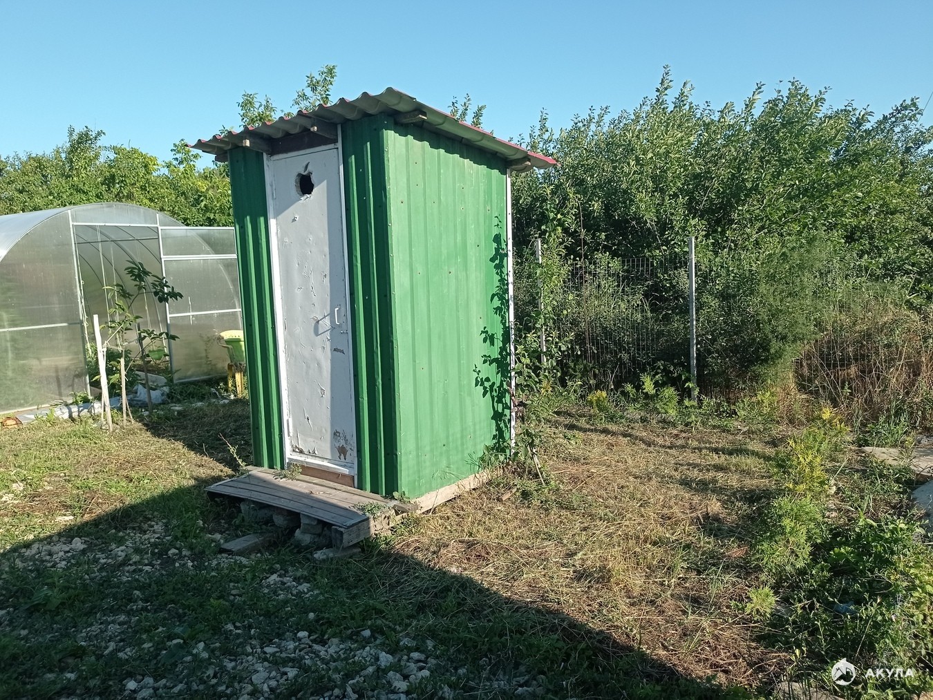 Установлен забор с откатными воротами, основательная теплица и дачный туалет.