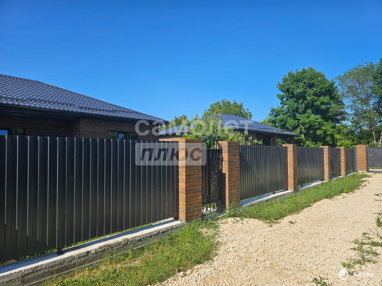 Дом располагается на прямоугольном участке правильной формы площадью 6 соток, участок по всему периметру огражден забором с красивыми воротами и калиткой.