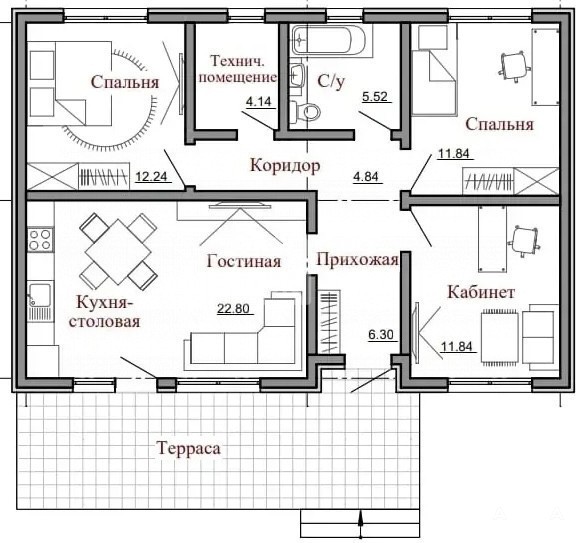 Дом - общей площадью 102 кв.м. с террасой, кухня-гостиная, 3 спальни, санузел, терраса, котельная;