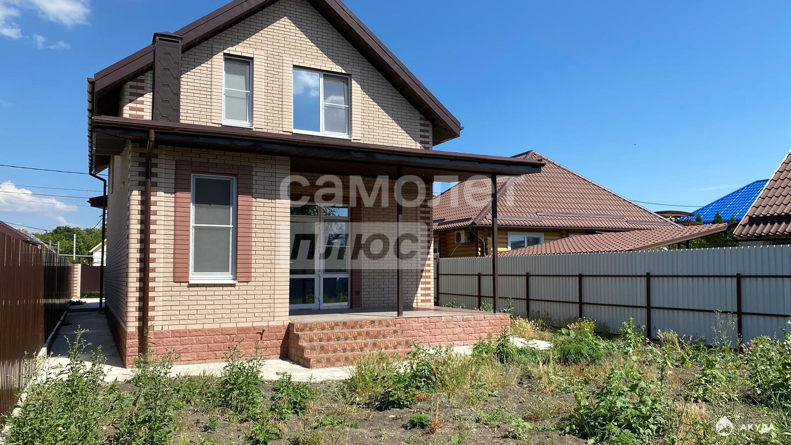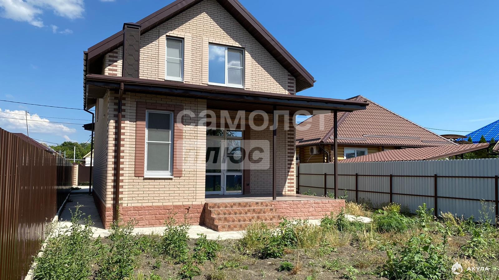 Земельный участок имеет правильную прямоугольную форму и площадь 4 сотки. Перед домом залита бетонная площадка под авто. Забор по периметру сплошной из металлопрофиля, передний фасад, кирпичный забор, распашные ворота и калитка. На фасаде есть светильники.