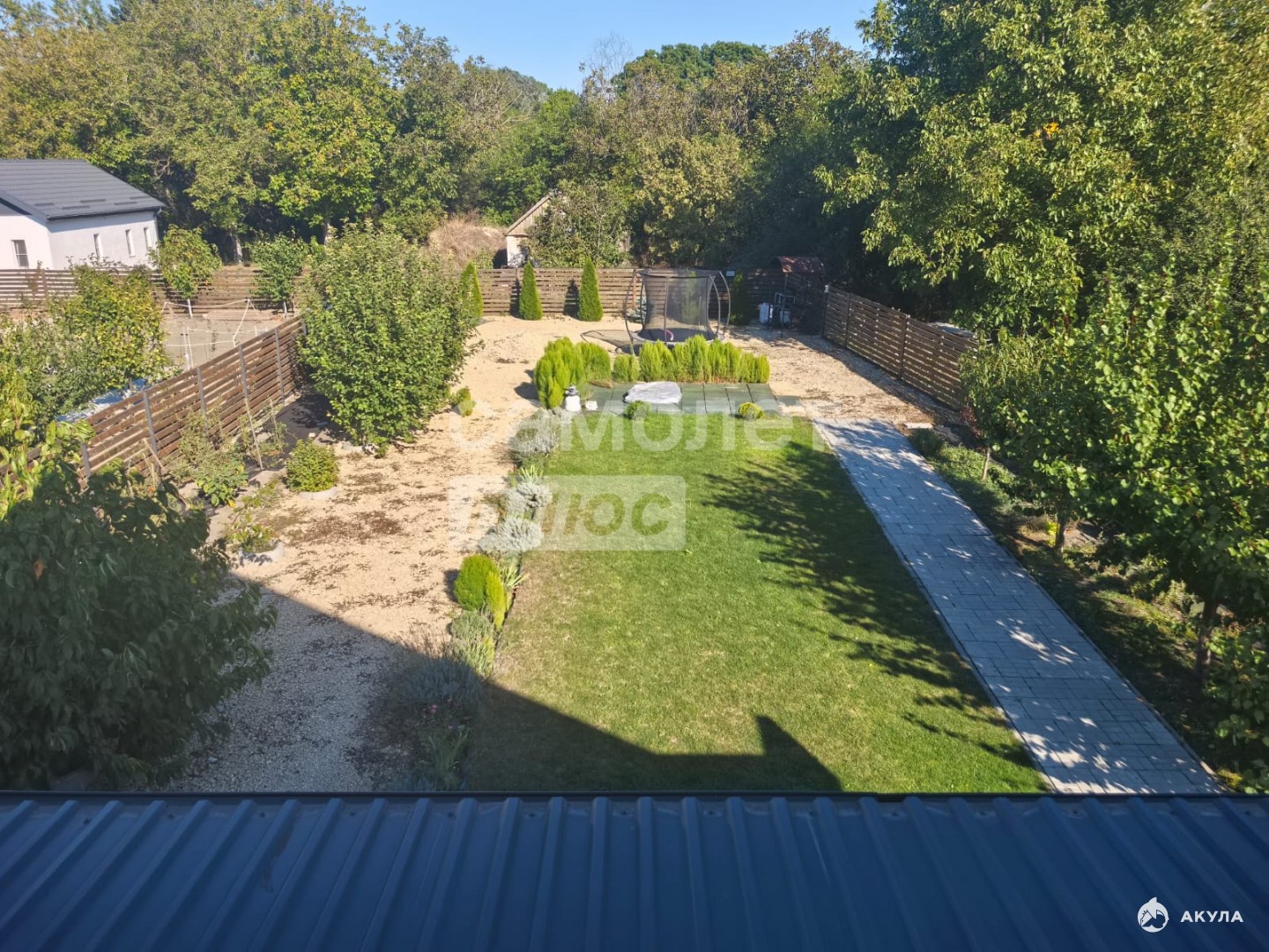 Участок для отдыха и развлечений: 8 соток земли с большой придомовой территорией, детской площадкой, двумя рулонными газонами, каркасным бассейном и площадкой под него.
