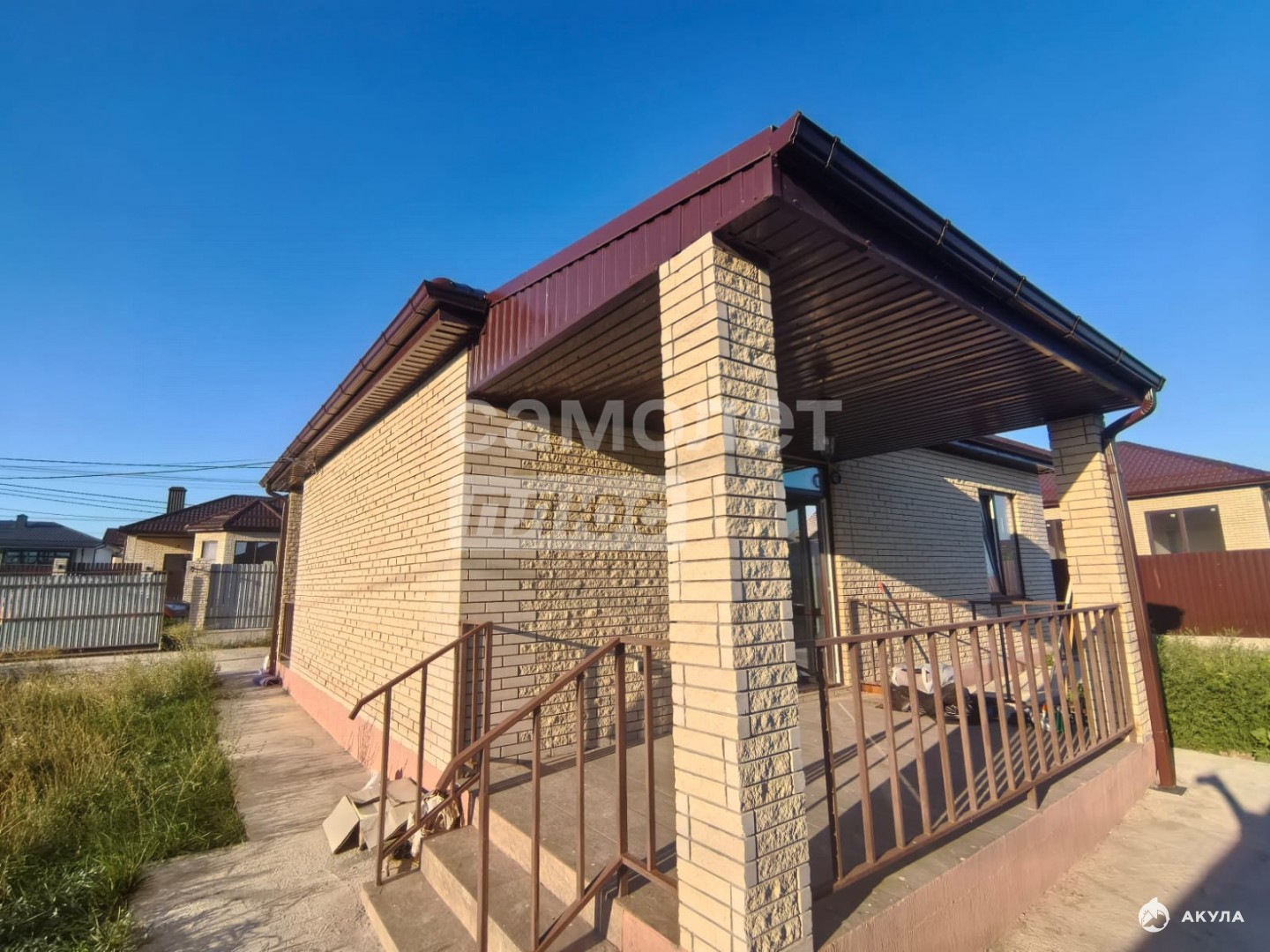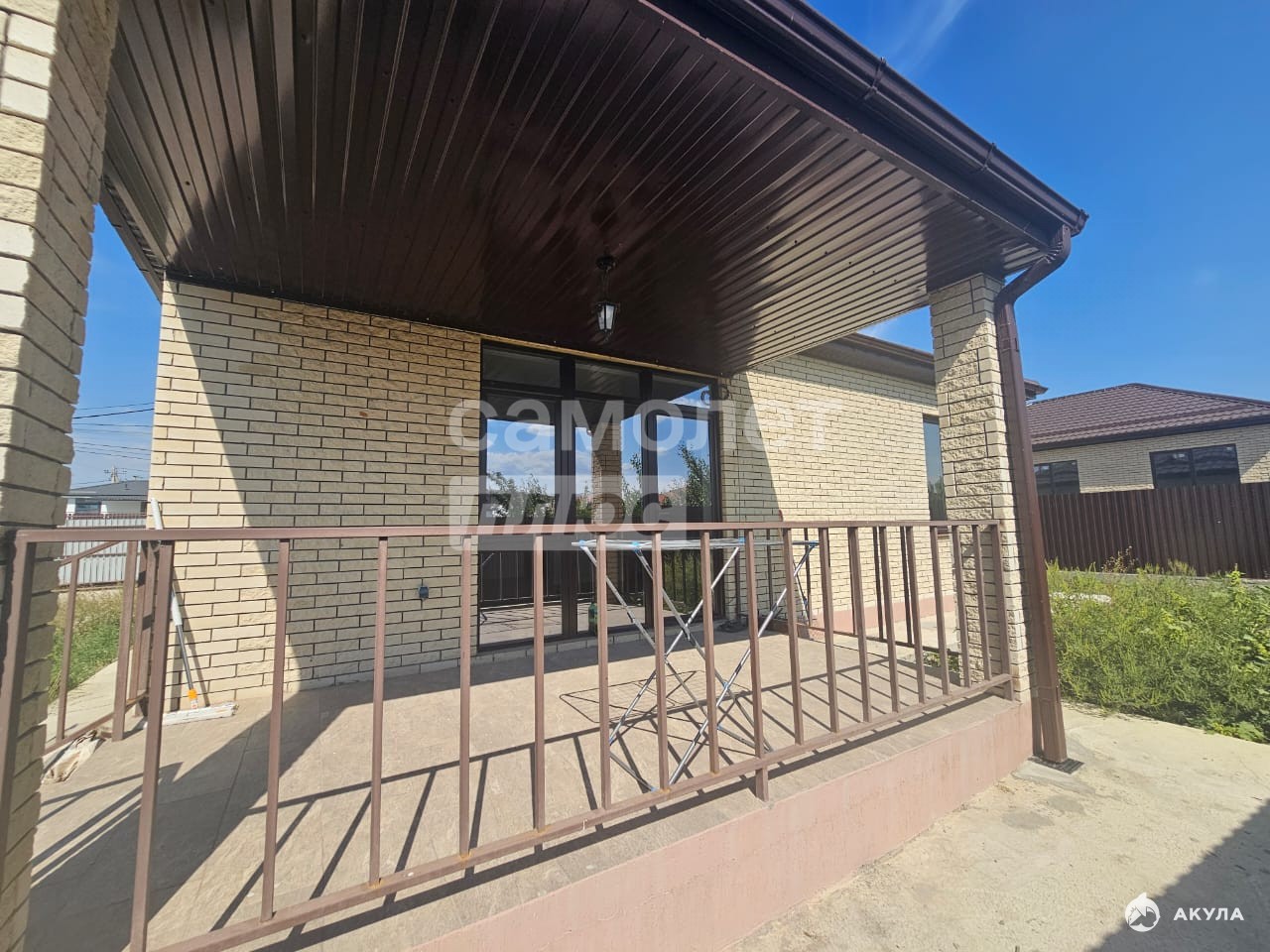 Участок: огорожен по периметру забором, по фасадной части штакетник с кирпичными колоннами в цвет дома. Заезд для автомобилей, дорожка к дому и отмостка по периметру дома забетонированы. Откатные ворота и калитка, уличное освещение на крыльце, террасе, заборе с датчиком день/ночь, завозная земля.