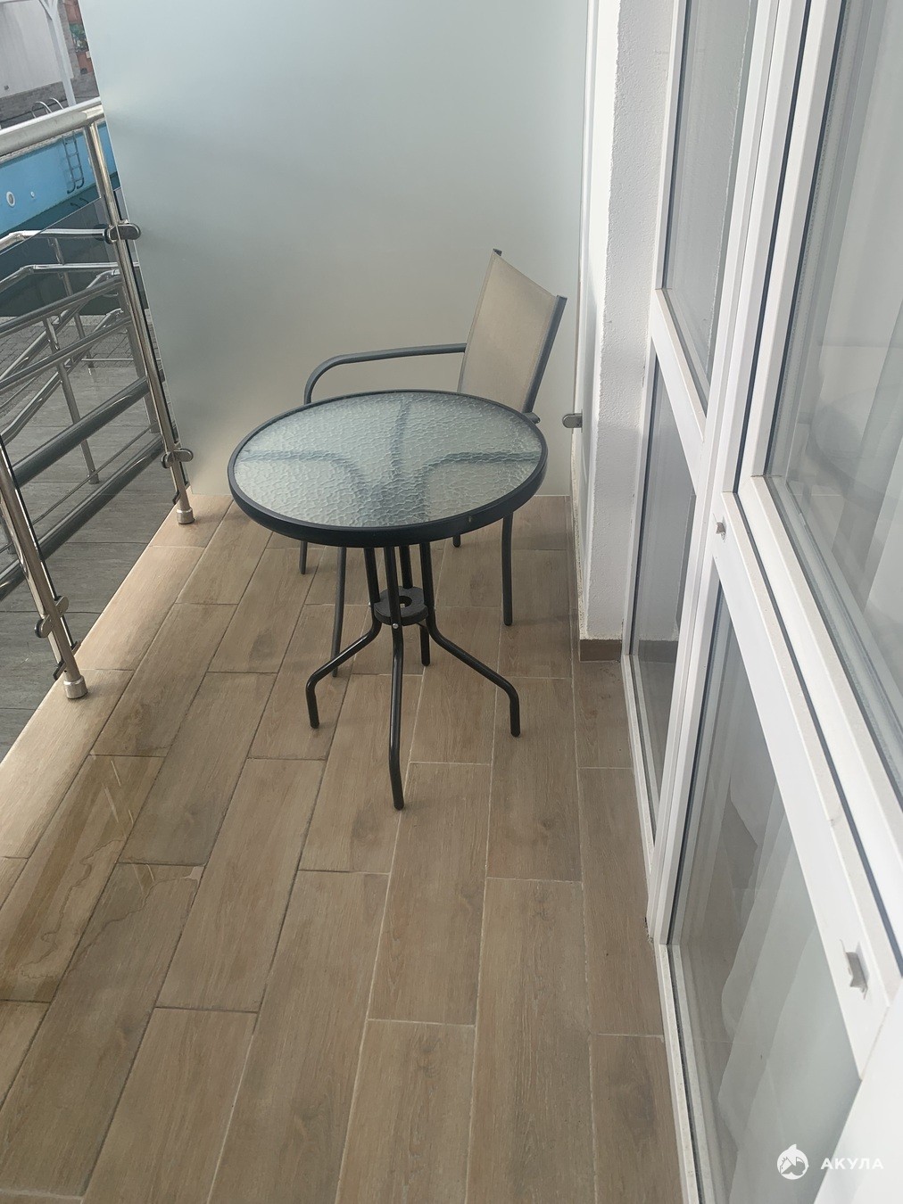 Выход на уютный балкон с видом на бассейн, зону отдыха.