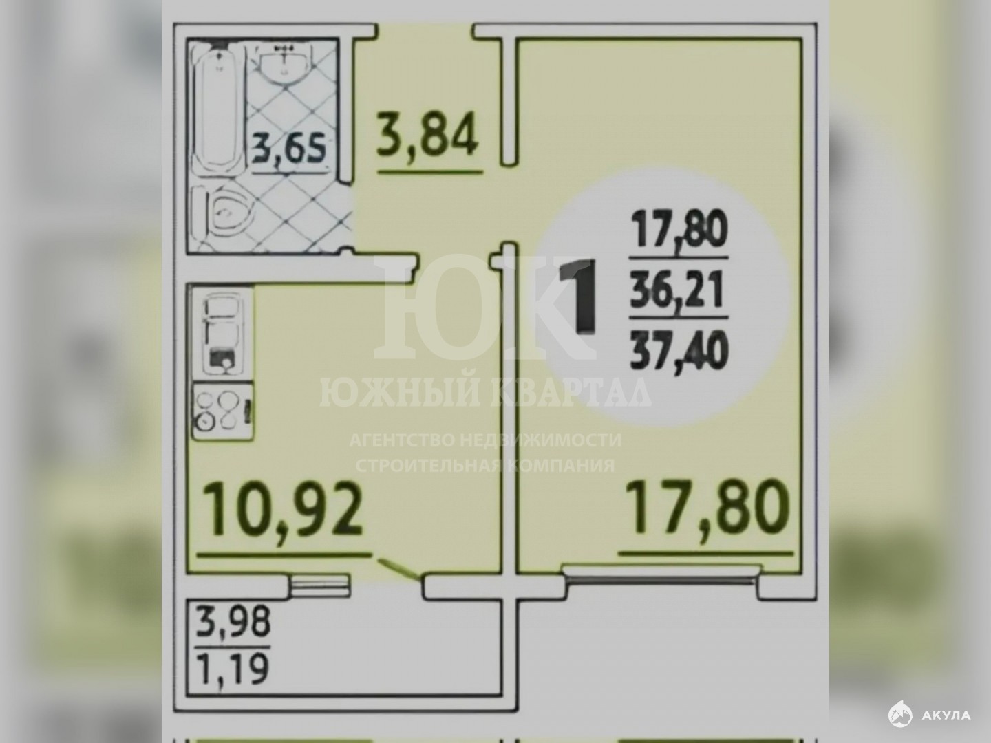 Планировка: 40, 19 м² (кухня 10, 92 + комната 17, 8 + большой балкон 3, 98).