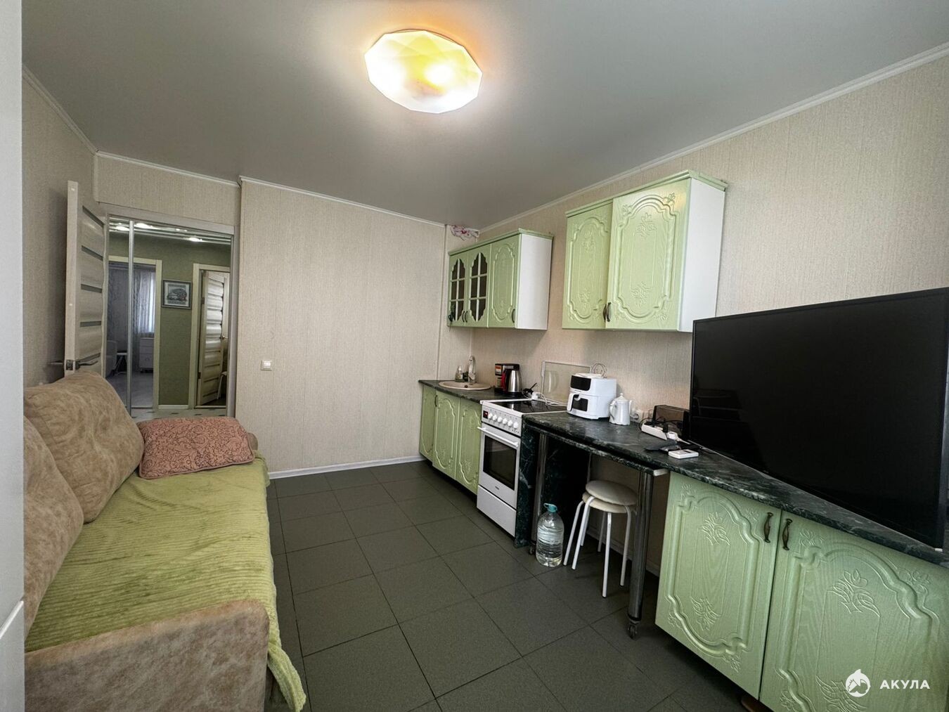 Квартира подходит как для проживания семьи так и для сдачи в аренду. Спальня оформленна в светлых тонах, визуально расширяя пространство, наполняя комнату сведом и уютом. Комната имеет выход на балкон, где по желанию можно организовать рабочий кабинет или зону отдыха. Кухня с полноценной зоной для приготовления еды и дополнительно расположен диван в случае необходимости организовать спальное место. Санузел совмещённый, с ванной. Отделка - плитка. В коридоре на всю длинну установлен зеркальный шкаф-купе для хранения личный вещей, тем самым оптимизируя пространство. Мебель остаётся.