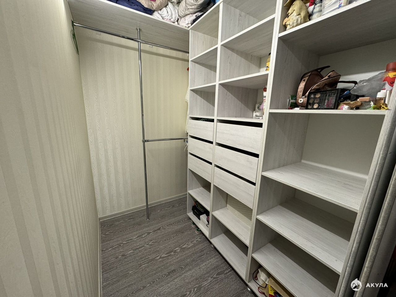 В квартире установлена большая гардеробная со всеми необходимыми полками и комплектующими , закрывают гардеробную двери купе с зеркалами .