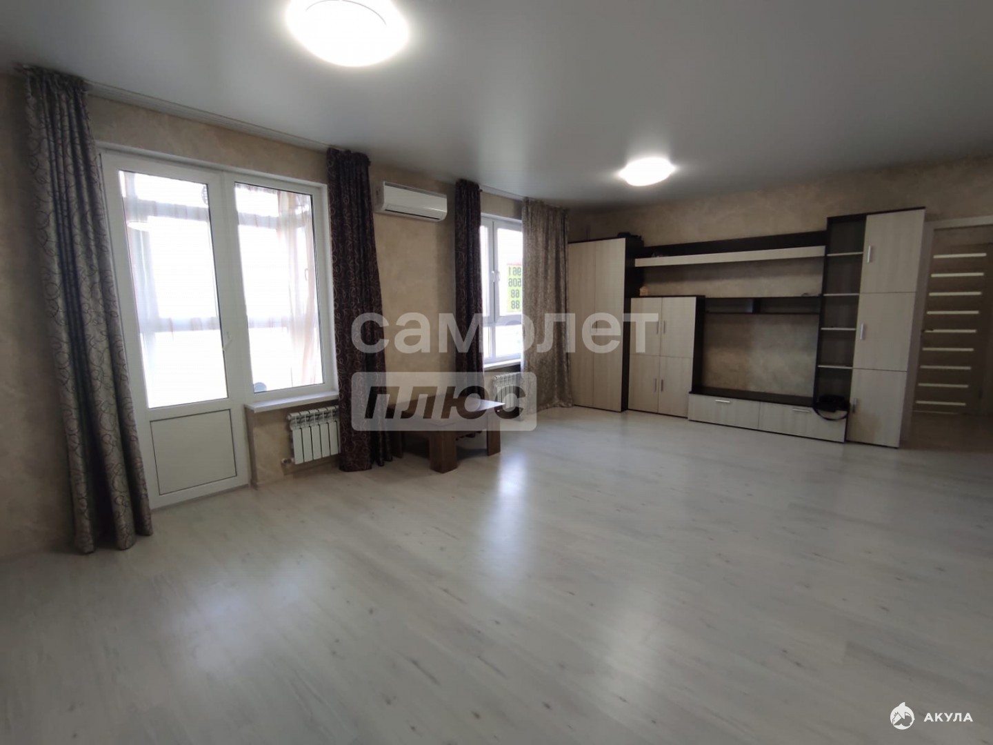 Общая площадь 60м2. От застройщика свободная планировка - можно при желании поставить стены или перегородки и зонировать комнату. Сделать полноценную двухкомнатную.