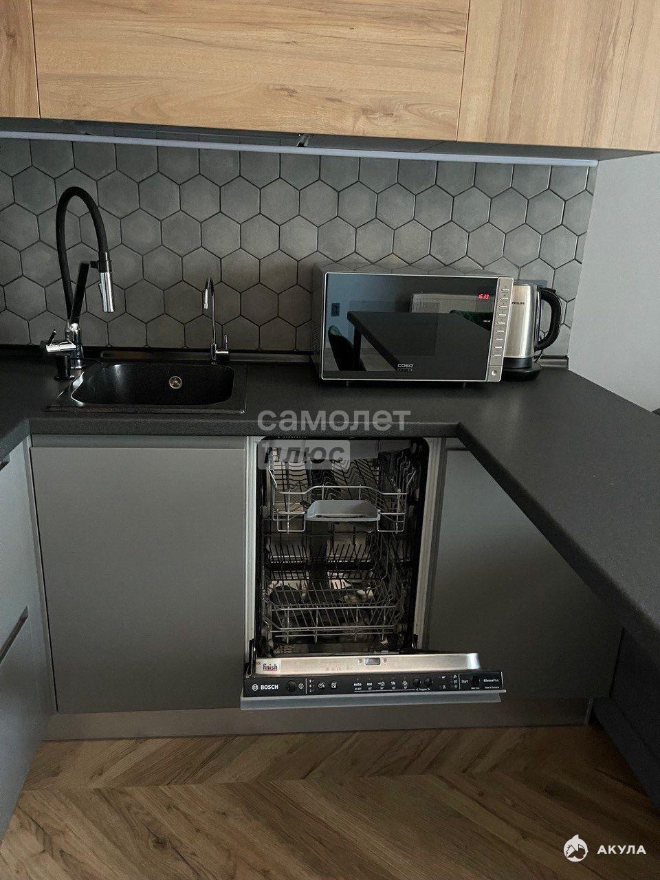 - Современная техника: духовой шкаф, индукционная плита, посудомоечная машина, холодильник No Frost, стиральная машина.
