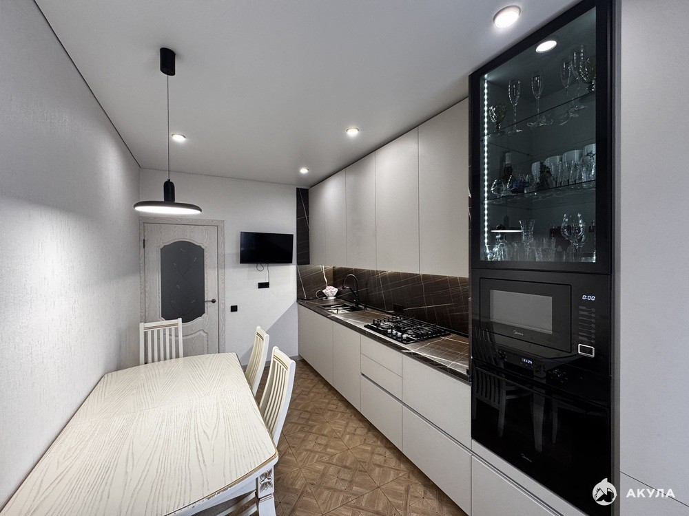 Установлен новый качественный кухонный гарнитур со встроенной техникой.