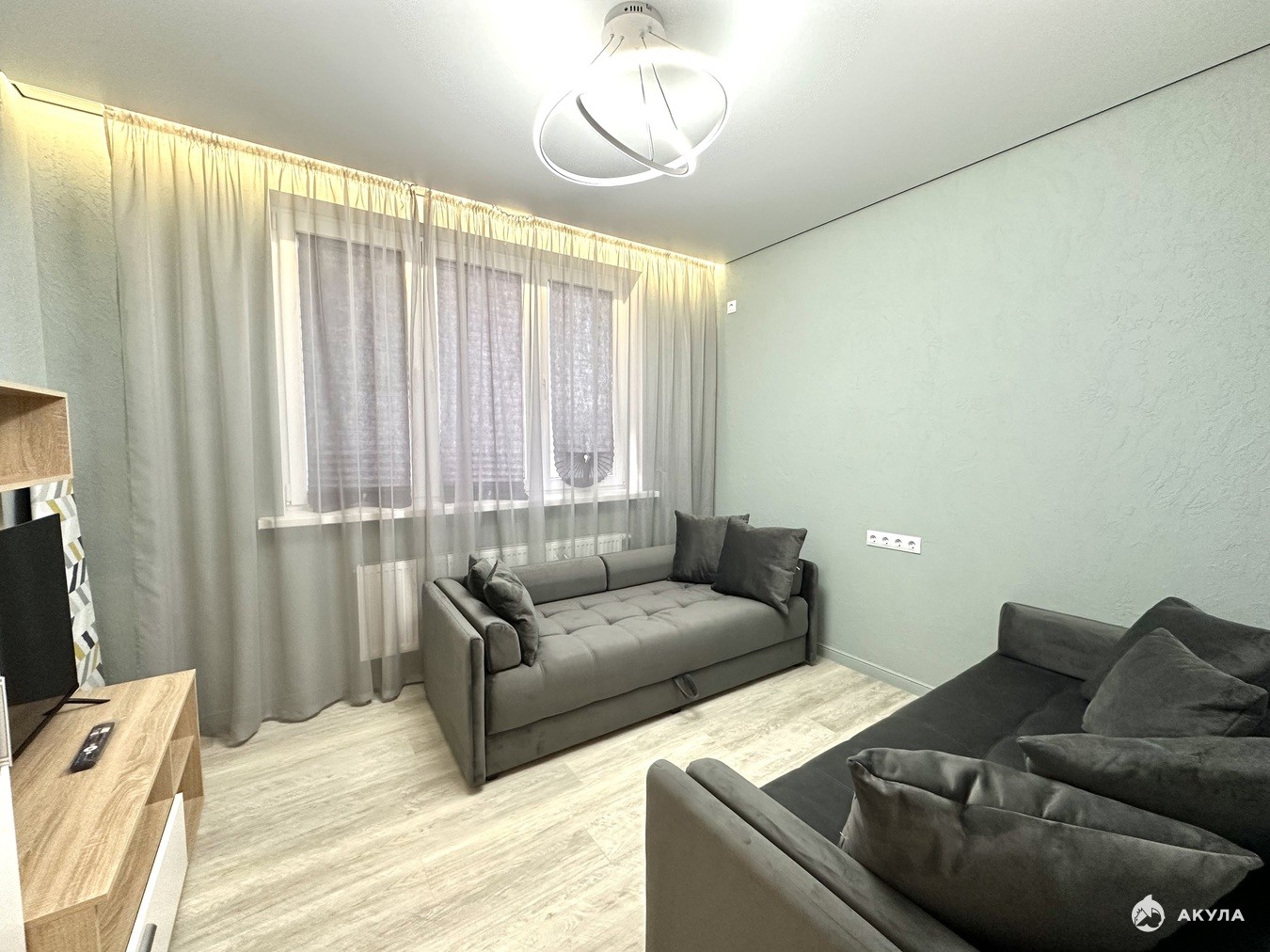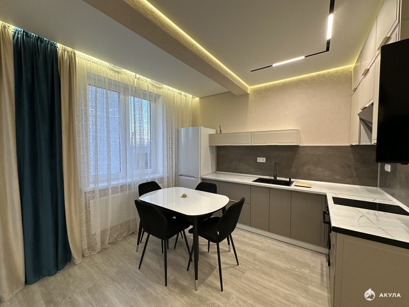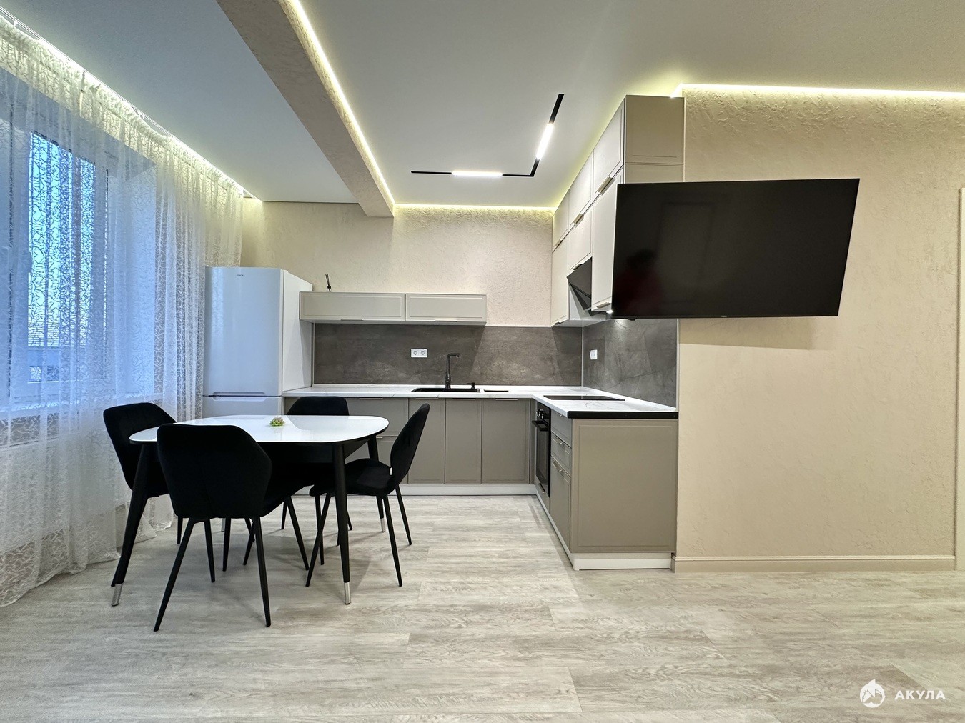 Кухня-гостиная оснащена современным гарнитуром и встроенной техникой, с выходом на балкон с панорамным остеклением.