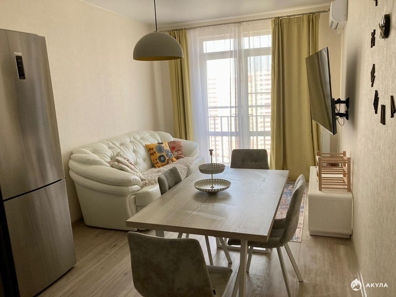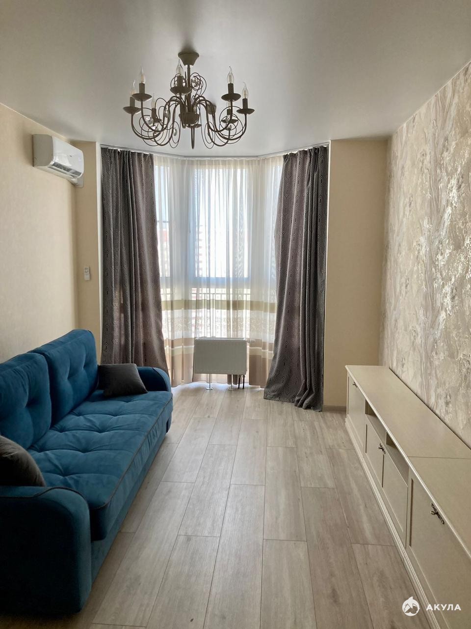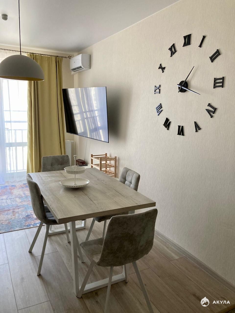 Окна квартиры смотрят не на улицу, а во двор и на горы, значит, не будет изнуряющей жары, при этом в каждой комнате установлены кондиционеры.
