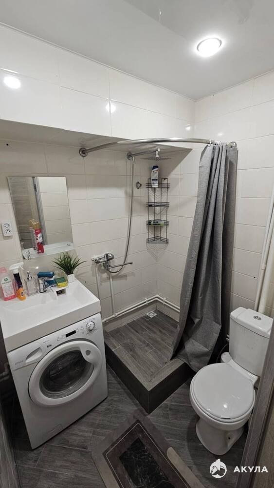 В санузле имеется душевой уголок, стиральная машина, раковина и вытяжка. На унитаз установлен новый качественный дренажный насос.
