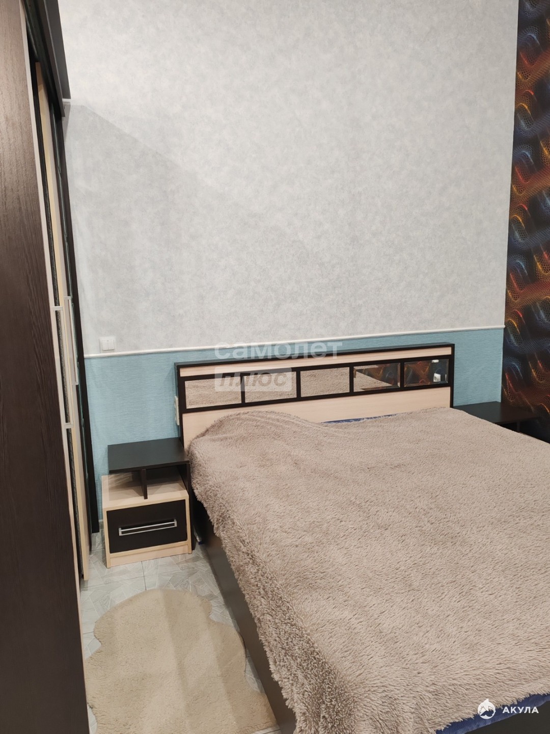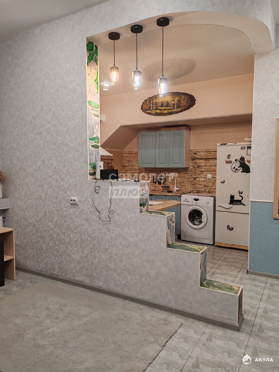 поклеены современные обои, на полу плитка,