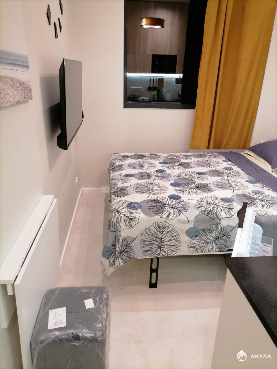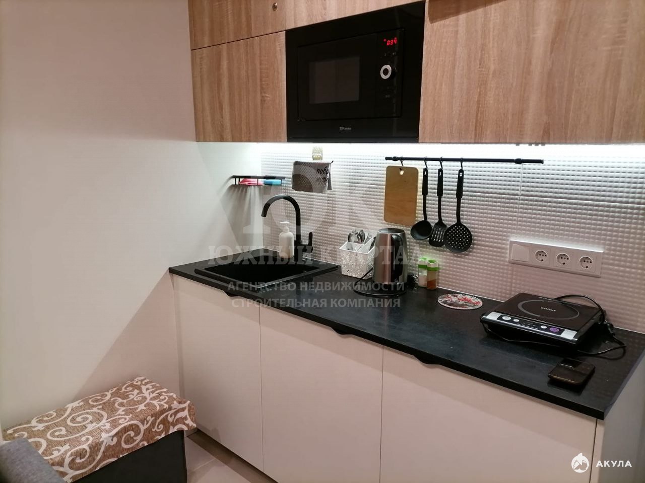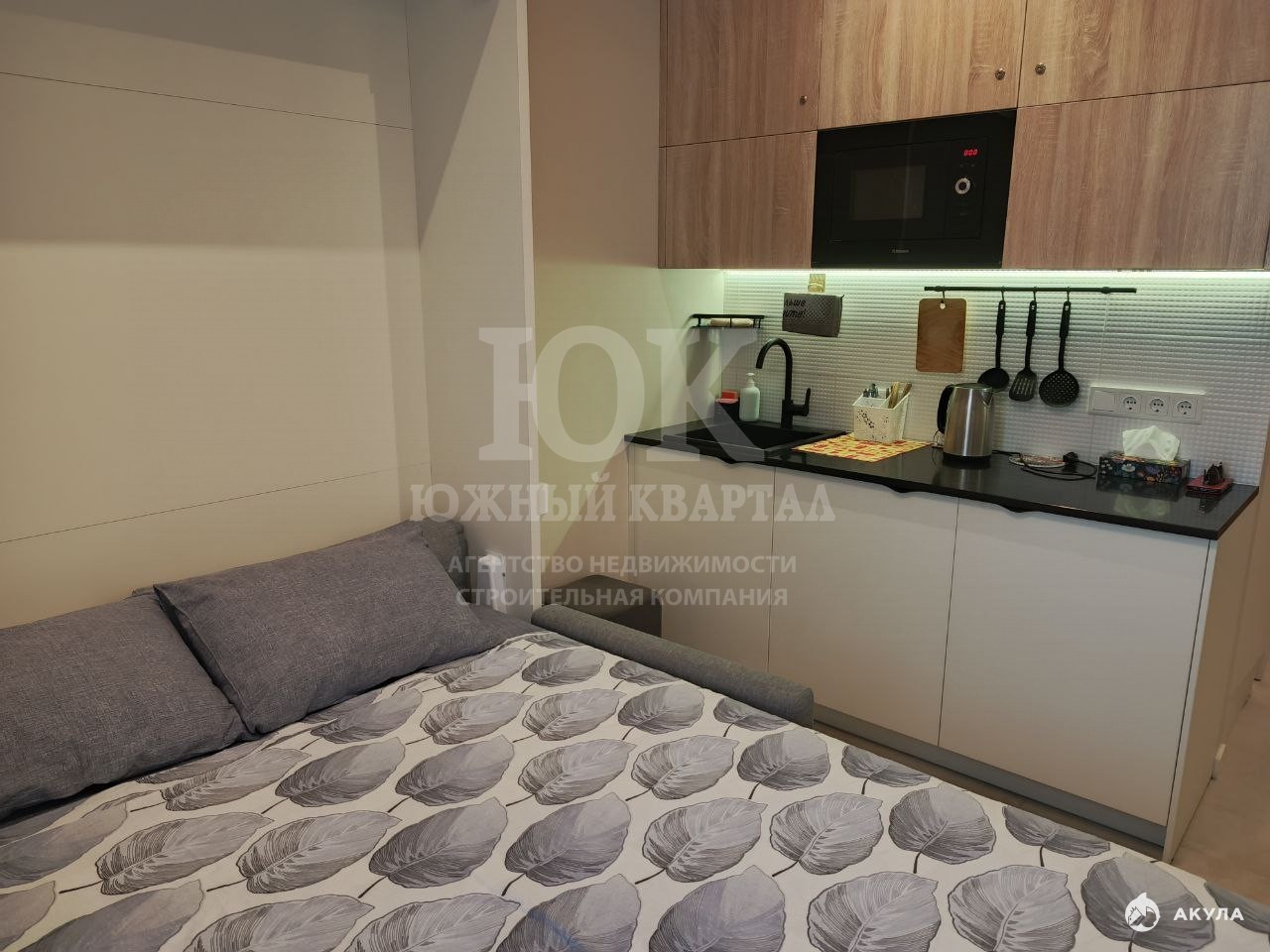 В квартире сделан качественный ремонт. Продается со встроенной мебелью и техникой – это диван, встроенная в стену двуспальная кровать, шкафы, стол, стулья, кухонный гарнитур, микроволновая печь, встроенный холодильник, стиральная машинка.
